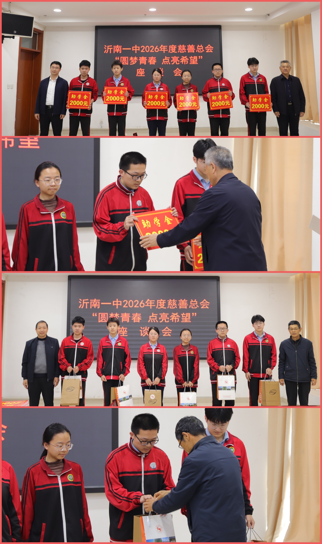 刘振奎会长、潘月兵校长为受助学生发放助学金;周景山副会长、王明亮副校长为救助学生捐赠生活用品。