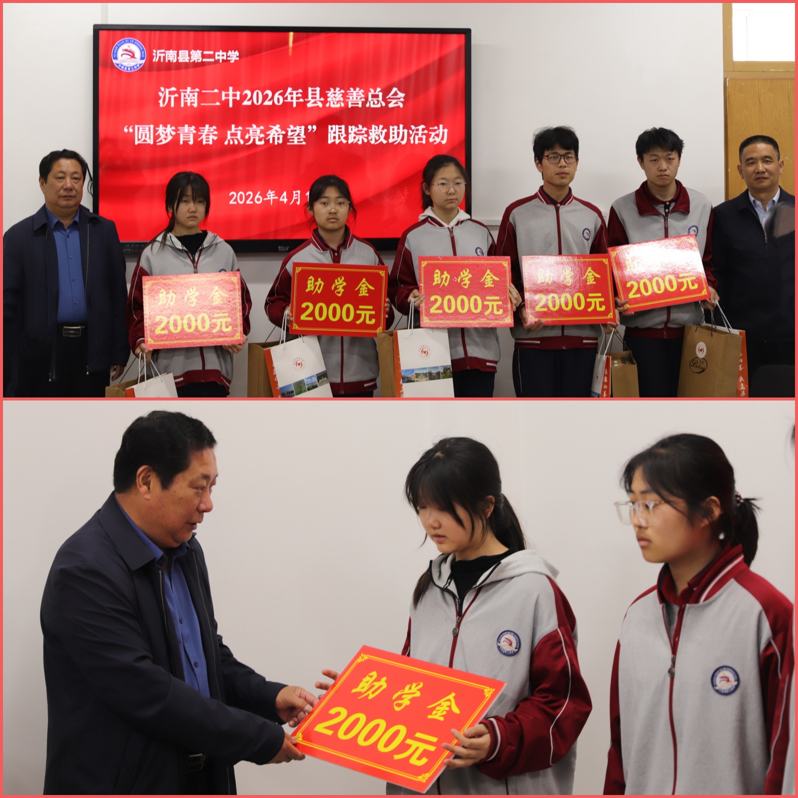 刘振奎会长、潘月兵校长为受助学生发放助学金;周景山副会长、王明亮副校长为救助学生捐赠生活用品。